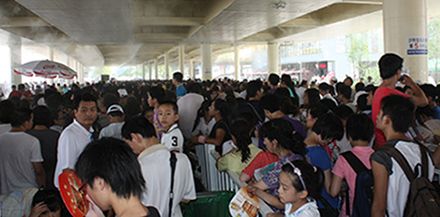 等候参观沙特馆的排队人群(左图右边柱子上写:“沙特馆在此排队需5小时以上”) . . |