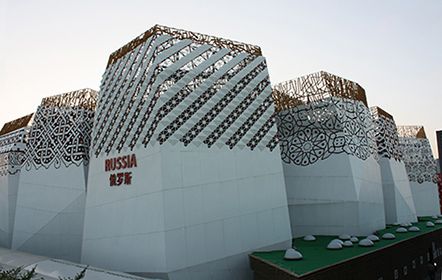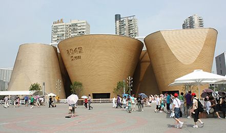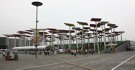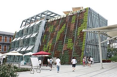 | 万科馆由7个以天然麦秸板为建筑材料的形似金灿灿麦垛的筒状建筑组成 | 法国阿尔萨斯案例馆的水幕太阳能墙体可以随着室外温度和日照强度的变化自动开闭 | ||||
