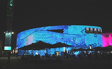 信息通信馆的外立面由来自废旧光盘的聚碳酸酯制成并采用LED变色效果 . |