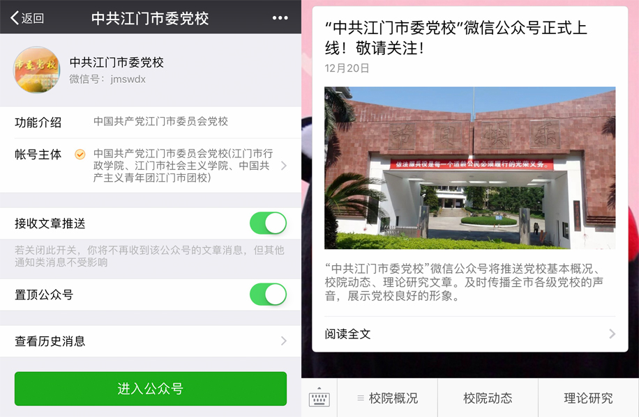 为充分利用新媒体平台,进一步巩固与壮大宣传思想文化阵地,促进内部信息沟通,充分发挥“三个阵地、一个熔炉”的重要作用,江门市委党校微信公众号——“中共江门市委党校”已开通,于12月19日正式上线。