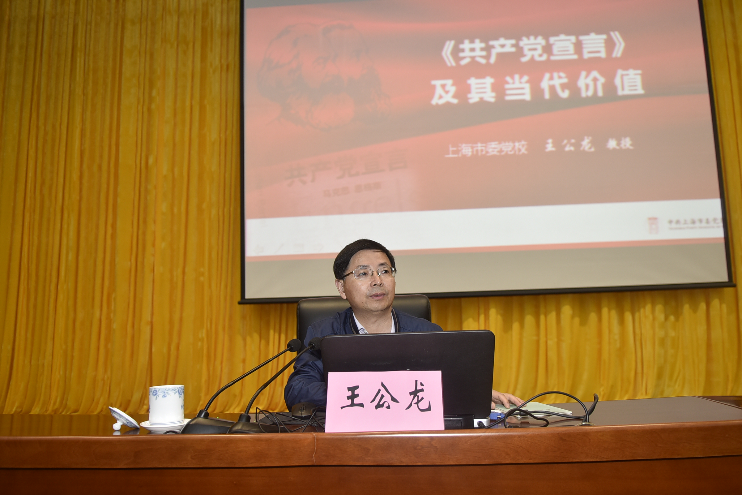 王公龙在授课中详细介绍了《共产党宣言》诞生的历史背景、基本思想和主要内容,阐述了《共产党宣言》不仅是根植于唯物史观的不朽之作,是科学社会主义最伟大的纲领性文件,更是马克思主义与时俱进理论品格的光辉典范。王公龙强调要认真研读《共产党宣言》,重温经典,认真学习贯彻党的十九大精神,毫不动摇坚持习近平新时代中国特色社会主义思想,不忘初心,牢记使命。