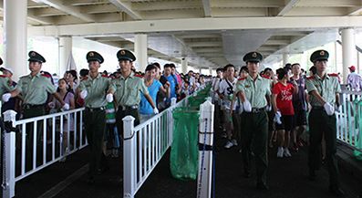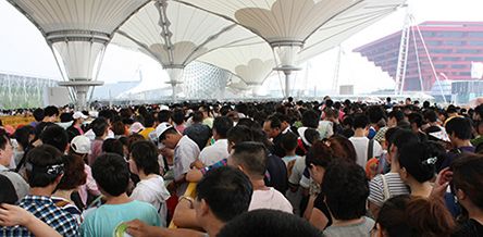等候参观沙特馆的排队人群(左图右边柱子上写:“沙特馆在此排队需5小时以上”) . . |
