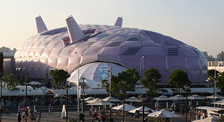 日本馆称“紫蚕岛”,外表的ETFE薄膜夹层内埋设曲面太阳能电池,上有三个用于空气交换的排热塔和呼吸孔 |