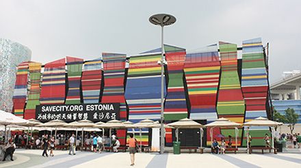 | 万科馆由7个以天然麦秸板为建筑材料的形似金灿灿麦垛的筒状建筑组成 | 法国阿尔萨斯案例馆的水幕太阳能墙体可以随着室外温度和日照强度的变化自动开闭 | ||||